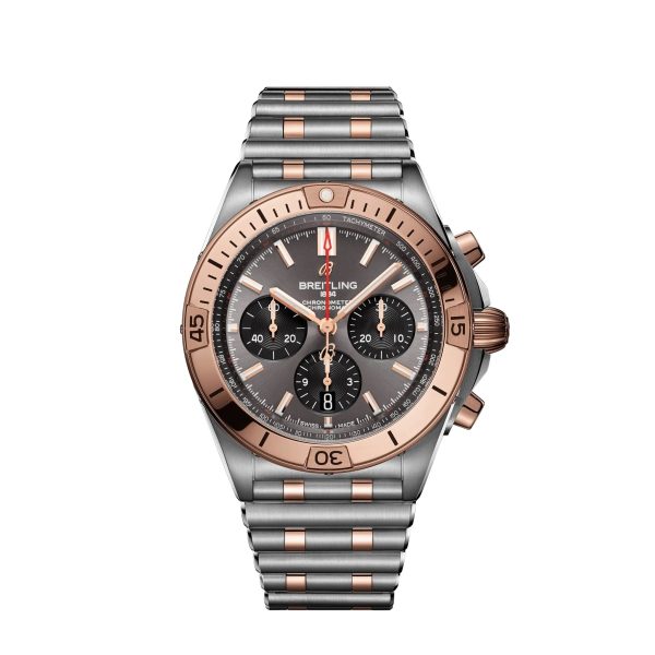 Breitling Chronomat B01 watch 42mm in Stainless Steel and 18k Red Gold, Reference UB0134101B1U1. This model has Cambered sapphire, glare proof both sides, an Anthracite dial and Unidirectional, ratcheted bezel of 18k Red Gold. The watch is self-winding mechanical caliber with 47 jewels and power reserve up to 70 hours. The Straight bracelet is Stainless Steel and 18k Red Gold with Fold clasp. The water resistance is up to 200m/660ft (20ATM).