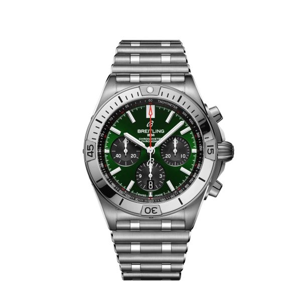Breitling Chronomat B01. Green dial 42 mm Stainless Steel case. Unidirectional, ratcheted bezel. Cambered sapphire, glareproofed both sides crystal. Breitling 01 calibre, Self-winding mechanical, 70 hours power reserve, 47 jewels. Stainless Steel bracelet Fold clasp. Water resistance 200 m (660 ft).