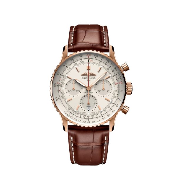 Breitling Navitimer B01 Chronograph. Silver Dial 41 mm 18k Red Gold case. Bidirectional, slide rule bezel. Cambered sapphire, glareproofed both sides crystal. Breitling 01 calibre, Self-winding mechanical, 70 hours power reserve, 47 jewels. Alligator Leather strap Folding clasp. Water resistance 30 m