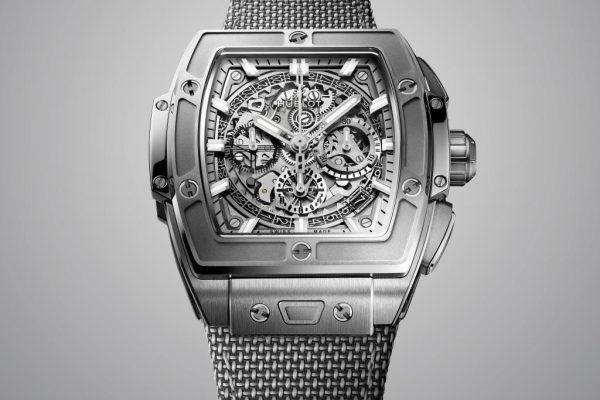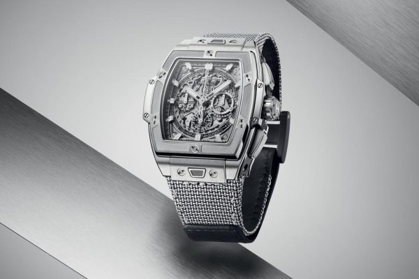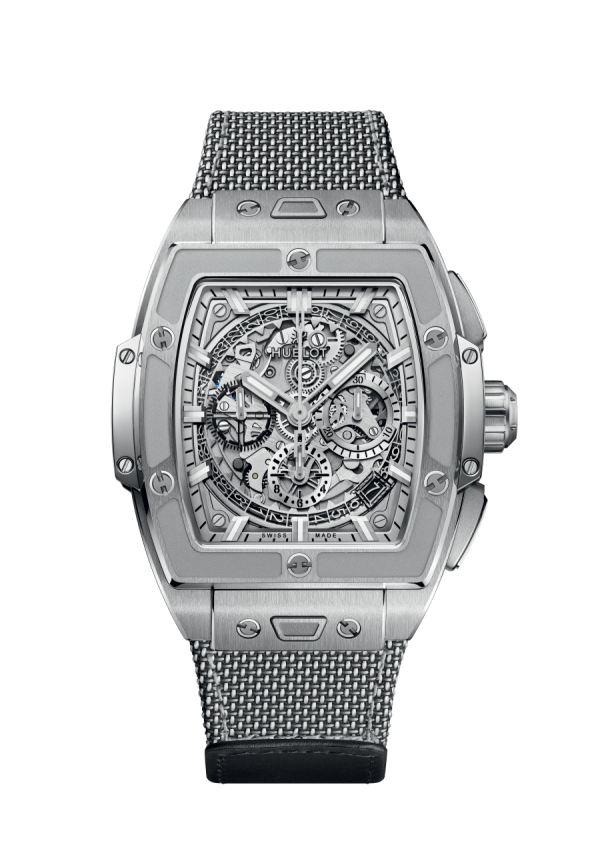 The result of experiments with color, texture and materials with which Hublot loves to surprise is a new product for 2023 – the impeccable watch Spirit of Big Bang Essential Gray, Titanium, 42mm, Reference 642.NX.0110.NR.HEC23. Despite the monochrome nature of the model, it is, as usual, very expressive, primarily due to the barrel-shaped body made of lightweight titanium, polished and satin-finished. Instead of a traditional dial, the watch has a sapphire crystal with large hour markers set inside a skeletonized movement. The large silver-tone minute and hour hands with skeletonized bottoms and hour markers are coated with Super-LumiNova, making the time easy to read even in low light conditions. The openwork is added by a silver-tone elegant central seconds hand with a counterweight in the form of the manufacturer’s “H” emblem. Next to the central hours and minutes, the complex structure of the movement and chronograph indicators at 3, 6 and 9 o’clock are clearly visible, which is controlled by polished titanium pushers at the 2 and 4 o’clock positions. Helps manage the clock. The date display with the date wheel fully open is located between 4 and 5 o’clock. The polished titanium crown is engraved with the Hublot logo and has contoured grooves for better grip. The anti-reflective sapphire crystal provides protection and clarity to the dial. The back cover is also made of sapphire crystal, which makes it possible to see the details of the mechanism with your own eyes and adds a touch of originality. The real decoration of the watch was the titanium bezel with many angles, edges, alternating textures, secured with 6 immediately recognizable titanium “H” screws with the Hublots signature inscription. The flawless operation of the watch is ensured by the HUB4700 self-winding skeletonized chronograph movement, which contains 31 jewels and has an approximate power reserve of 50 hours. This model is presented on an elegant and comfortable rubber strap with black and silver lining and a folding clasp, as well as an additional gray fabric strap with Velcro closure and a black ceramic buckle. Water resistance is up to 100m/330ft (10 ATM).