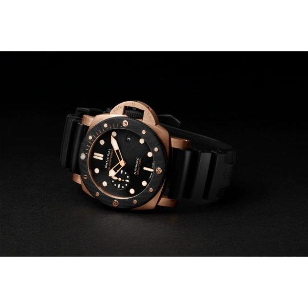 Unworn Panerai Submersible QuarantaQuattro Goldtech™ OroCarbo PAM01070. 44 mm, Black dial, Brushed Goldtech™ case, Goldtech™ with Carbotech anti-clockwise rotating bezel with graduated scale bezel, P.900 calibre, Automatic mechanical Movement, 23 jewels, 3 days power reserve, Caoutchouc Black straps. Water resistant to 300 m.