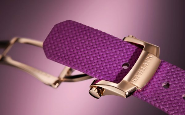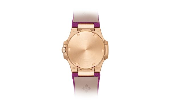 Introducing the Patek Philippe Nautilus 7010R-013, a luxurious and elegantly crafted timepiece that epitomizes sophistication. This exquisite 32mm watch is fashioned from 18k rose gold, reflecting the pinnacle of refined style. The dial, in a stunning lacquered purple, is both vibrant and subtle, set against the shimmer of rose gold applied hour markers and numerals. Each marker is enhanced with a luminescent coating for superior readability under varying lighting conditions. The date display at 3 o’clock is seamlessly integrated, maintaining the dial’s sleek and uncluttered appearance. The bezel is adorned with 46 sparkling diamonds, totaling approximately 0.73 ct, adding a brilliant touch of luxury and making the watch a true statement piece. These meticulously set gems not only elevate the watch’s allure but also showcase Patek Philippe’s commitment to exceptional craftsmanship. Driven by the quartz caliber E 23‑250 S C, this model promises precise and reliable timekeeping, ideal for daily wear. The sapphire-crystal case back provides a glimpse into the flawless engineering that powers the watch. The bracelet, Composite material with fabric pattern. It ensures a comfortable and secure fit with a fold-over clasp, designed for both safety and style.