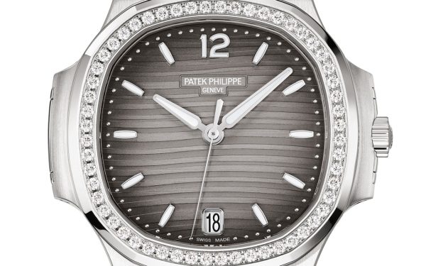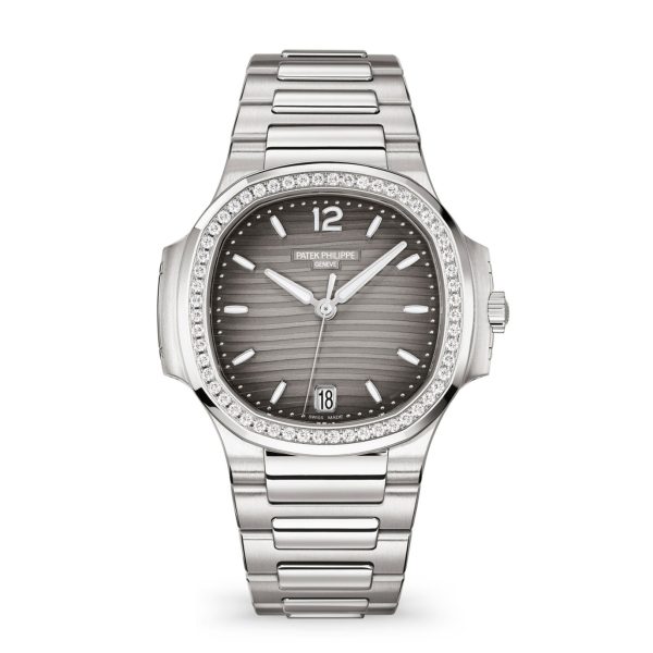 Discover the Patek Philippe Nautilus 7118/1200A-011, a stunning representation of elegance and precision craftsmanship. This women’s timepiece, meticulously crafted in stainless steel, boasts a 35.2mm case that exudes a modern and sophisticated charm, perfect for any occasion. The eye-catching gray opaline dial is adorned with a distinctive wave decoration, enhancing its visual appeal. It features applied numerals and hour markers in luminescent coating, ensuring excellent readability. The date display is subtly positioned at 6 o’clock, integrated seamlessly into the dial for a clean aesthetic. What sets this model apart is the dazzling bezel, adorned with 56 diamonds, totaling approximately 0.67 ct. This gem-setting not only adds a touch of brilliance but also underscores the luxurious appeal of the watch. Powered by the Patek Philippe Caliber 26‑330 S C, a self-winding mechanical movement known for its reliability and precision, this watch offers a power reserve of 35-45 hours. The sapphire-crystal case back provides a fascinating view into the complex workings of the movement, showcasing the exceptional engineering that defines Patek Philippe. The stainless steel bracelet complements the case with its polished and satin finish, and is equipped with a fold-over clasp for a secure and comfortable fit. The watch also boasts a water resistance of up to 30 meters, making it as functional as it is beautiful.