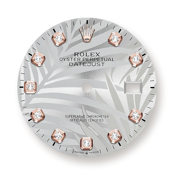 - Dial color: Silver dial with palm motif and 10 Diamonds as hour markers framed in 18k Everose Gold
