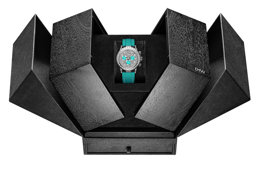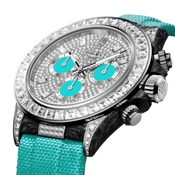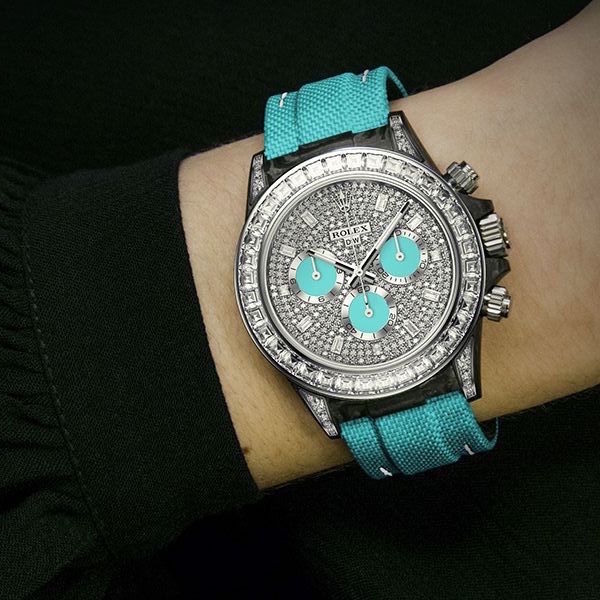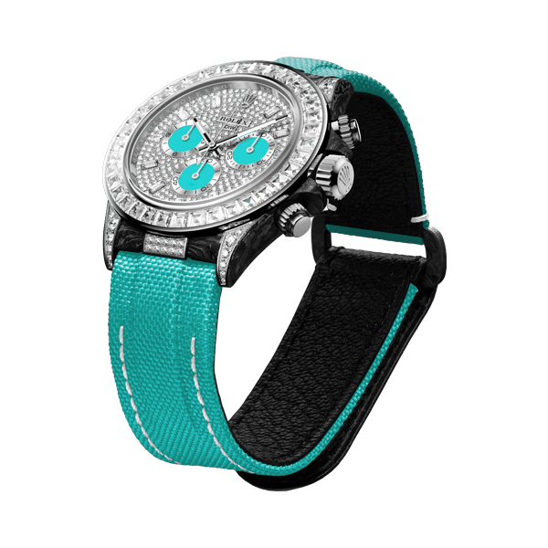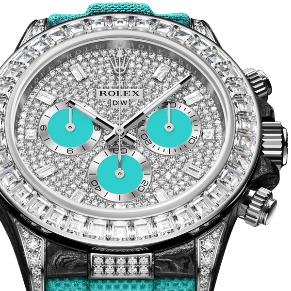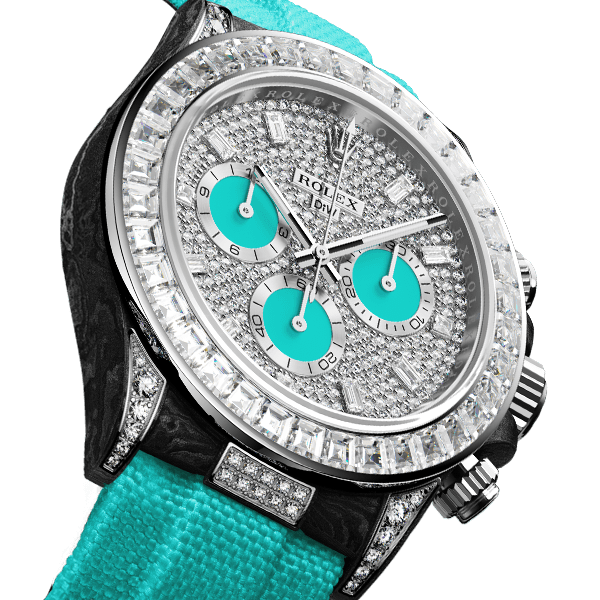 The Daytona Rainbow Blue is the new definition of high-end customization. Each gem in the bezel is hand encrusted, highlighting the beautiful “Miami blue” tone of the dial and strap. Exclusivity of its own.