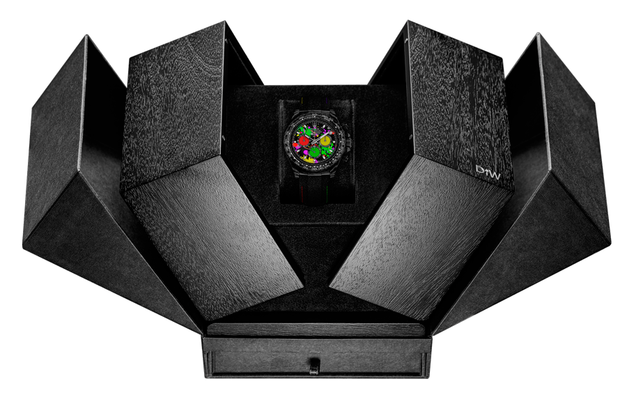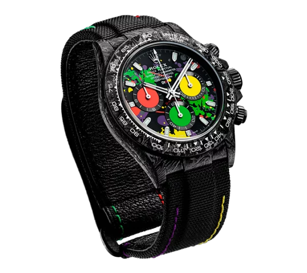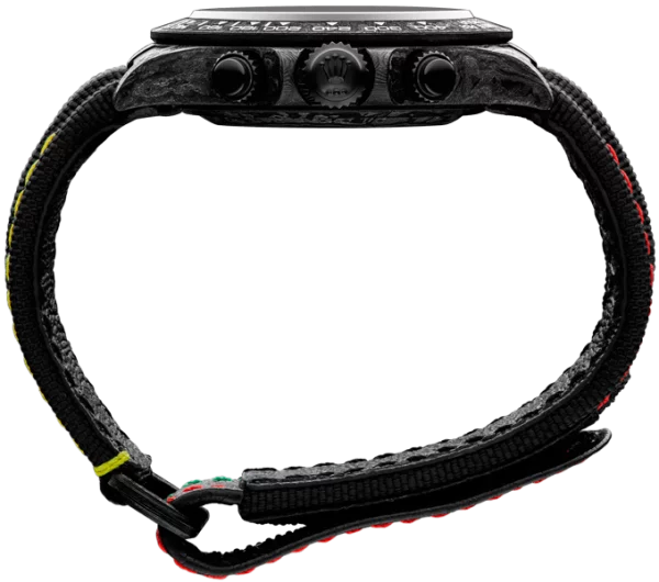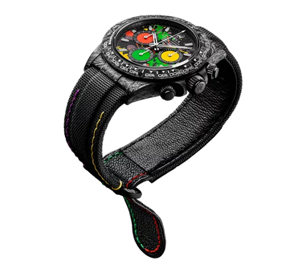 The case, crown, chronograph pushers and buckle on the strap of our unique Daytona are made out of carbon fiber. It is the lightest Daytona ever produced with less than 50 grams of weight!