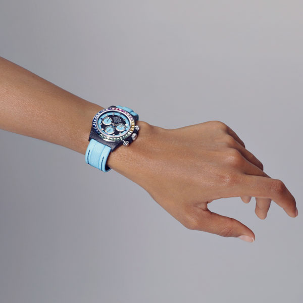 The Daytona Rainbow Blue is the new definition of high-end customization. Each gem in the bezel is hand encrusted, highlighting the beautiful “Miami blue” tone of the dial and strap. Exclusivity of its own.
