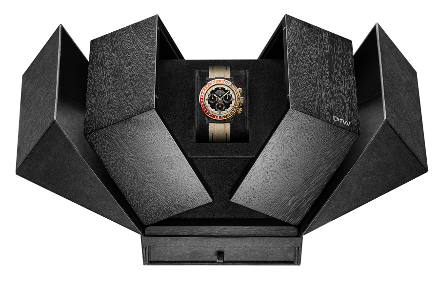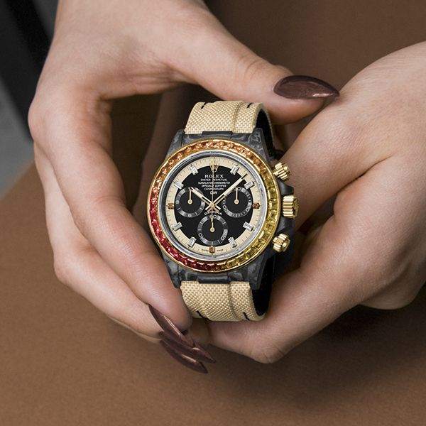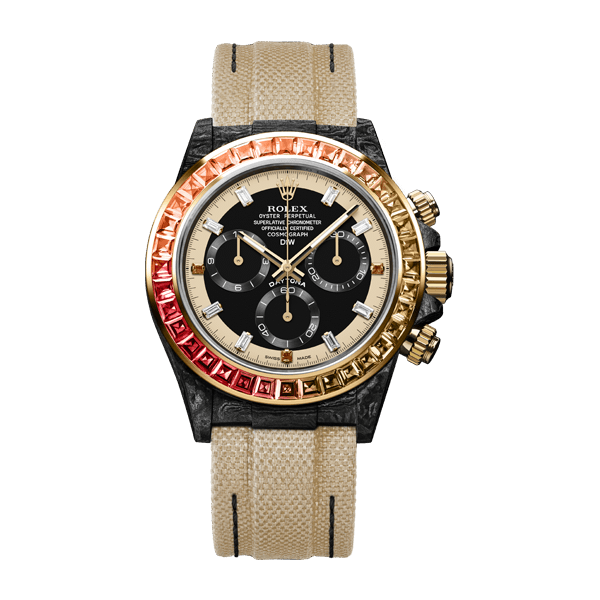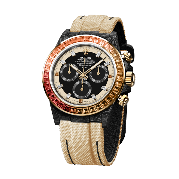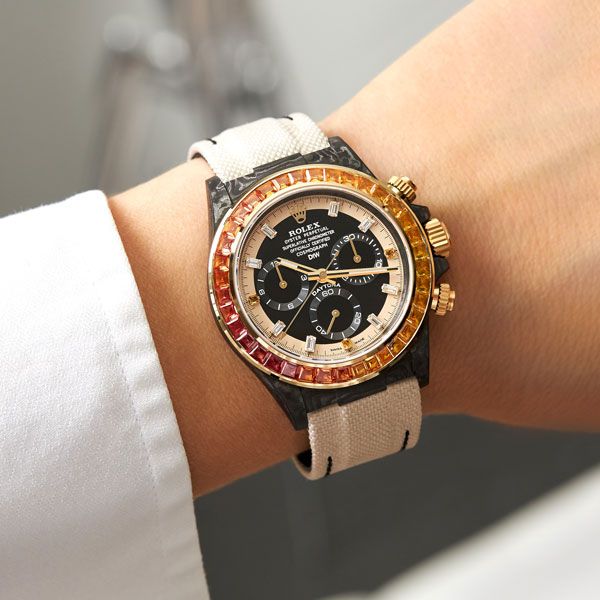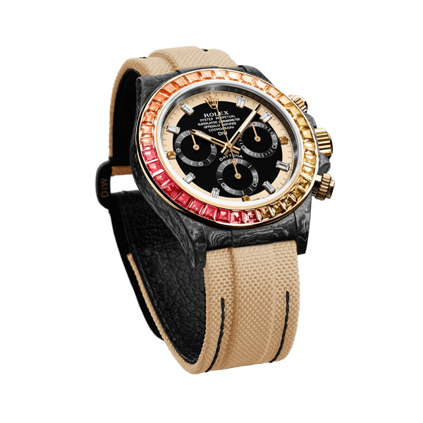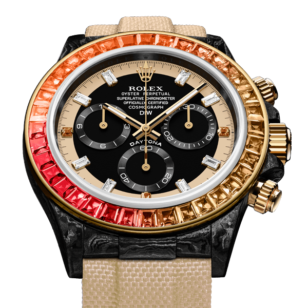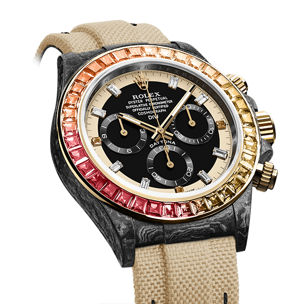 The Daytona Rainbow Sunray is the bright essence of undescribable elegance. Each precious gem in the bezel is hand encrusted. Thanks to the carbon case, the weight of this piece is just about 60 grams!