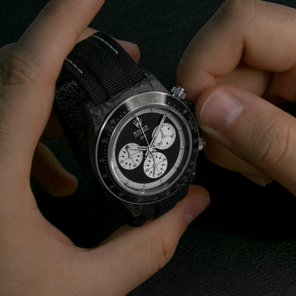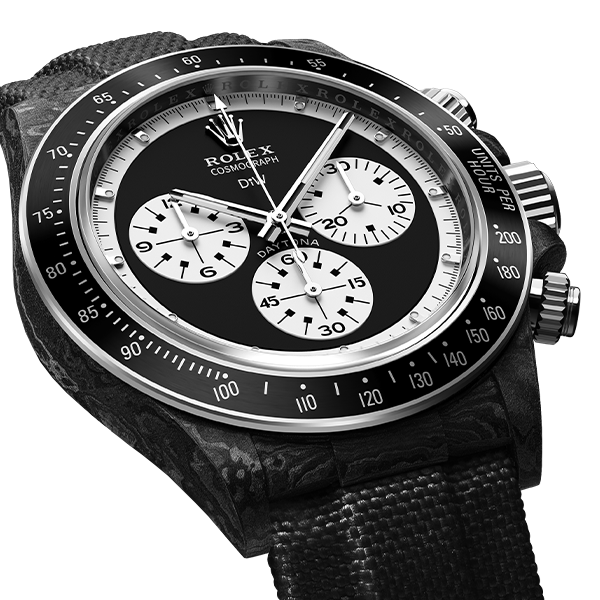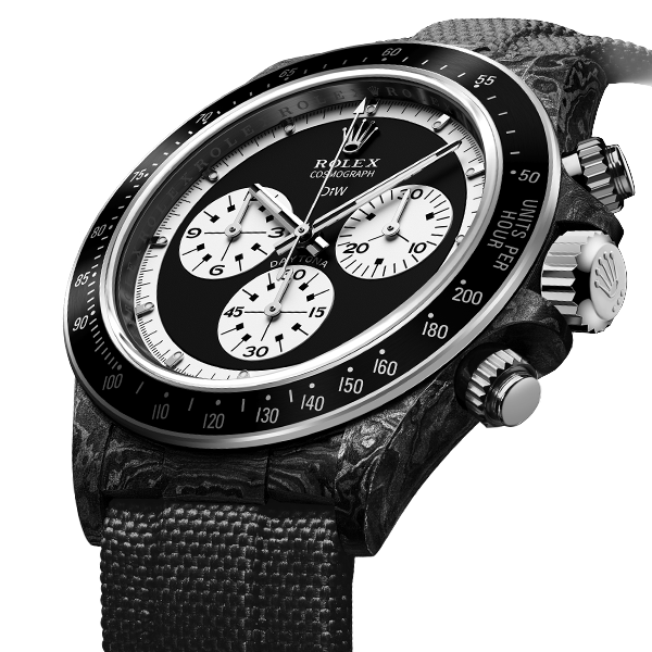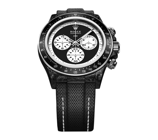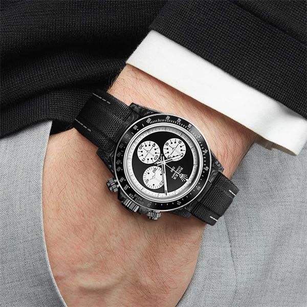 The model incorporates a solid black dial with white elements and ceramic bezel, all in the lightest carbon case. The movement is automatic and it’s powered by the reliable caliber 4130.