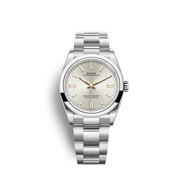 Rolex Oyster Perpetual 36mm watch with brushed Stainless Steel case with polished finished sides, Reference 126000-0001. This model has Silver dial with a fine sunray finish which acheives a very light shadings of grey. Chromalight display highly legible with long-lasting blue luminescence. The dial is adorned with polished 18k Yellow Gold hands – hour and minute hands with partial luminous fill and applied 18k Yellow gold polished index hour markers with luminous fill. Fine printed minutes/seconds track. Polished Stainless Steel “Twinlock” crown. The dial closed by a Scratch-resistant Sapphire Crystal and solid case back made. The watch is equipped domed fixed polished Stainless Steel bezel. The watch is mechanical self-winding Manufacture Rolex 3230 contains 31 Jewels and has an approximate power reserve of 70 hours of power reserve. This model presented on Oyster bracelet of brushed Stainless Steel with a Folding Oysterlock safety clasp with Easylink 5 mm comfort extension link. The water resistance is up to 100m/330ft (10 ATM).