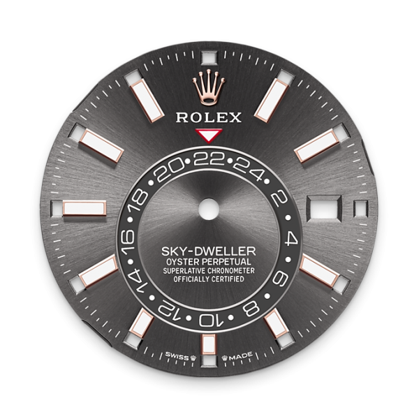 Unworn watch Rolex Sky-Dweller, 42mm, 18k Everose Gold, Ref# 336935-0004. New for 2023, a true masterpiece of engineering. Elegant and versatile, this stunning timepiece is the perfect luxury accessory for the modern traveler. This superb chronometer features a Slate dial, which is the perfect backdrop for the luminous 18k Everose Gold index hour markers and hands, making it easy to read the time even in low light conditions. A well-readable minute scale is applied along the outer contour of the dial. The sophisticated multi-function display makes it easy to keep track of the time in two different time zones. The reference time is displayed in 24-hour format on an off-center dial, while the local time is read using the normal central hands. The annual calendar, named Saros, is powered by a patented mechanism and features an innovative display: the months of the year are shown in 12 windows around the circumference of the dial, behind the hour marker – the current month is displayed in red. The instantaneous date change is related to local time. The ribbed, easy-to-grip Triplock 18k Everose Gold screw-down crown features a triple water-resistance system in and Rolex logo decorated. The dial is covered with a scratch-resistant sapphire crystal with anti-reflective coating and Cyclops lens at the 3 o’clock position. The fluted bezel in 18k Everose Gold is a true hallmark of Rolex. Bidirectional rotatable, it is part of the Ring Command system and, when interacting with the crown, allows the user to select watch functions one by one and adjust them easily, quickly and simply. The model is powered by the innovative in-house Rolex mechanical movement, caliber 9002, contains 29 jewels and has an approximate power reserve of approximately 72 hours. This delightful timepiece is presented on an Oyster bracelet with one-piece three-piece links in 18k Everose Gold. Thanks to the new hidden fastening system under the bezel, there is a perfect visual continuity between the bracelet and the case. The bracelet features an 18k Everose Gold Oysterclasp folding clasp with Rolex’s original Easylink patented quick extension system of approximately 5mm for added comfort in all circumstances. Water resistant up to 100m/330ft (10 ATM).