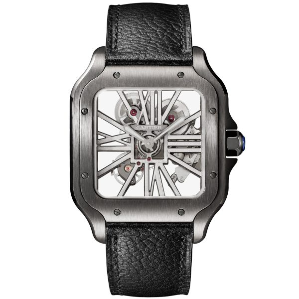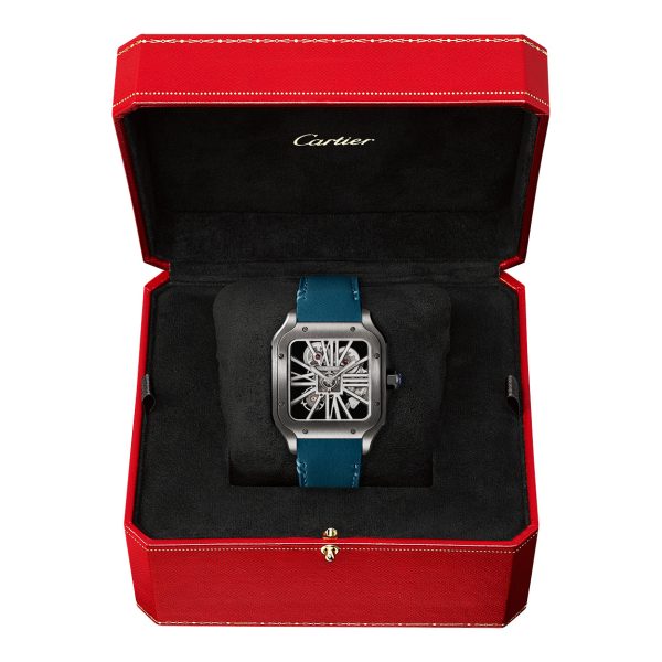 Cartier Santos de Cartier Large Skeleton Black ADLC Men’s Watch WHSA0023. Black ADLC coated steel 47.5mm x 39.7mm case and bezel all on a blue leather strap and comes complete with complimentary black strap. This men’s watch features a black skeleton dial with luminescent coating. Synthetic sapphire crystal glass and water resistant up to 100m. Power reserve up to 72 hours. Manual-wind movement.