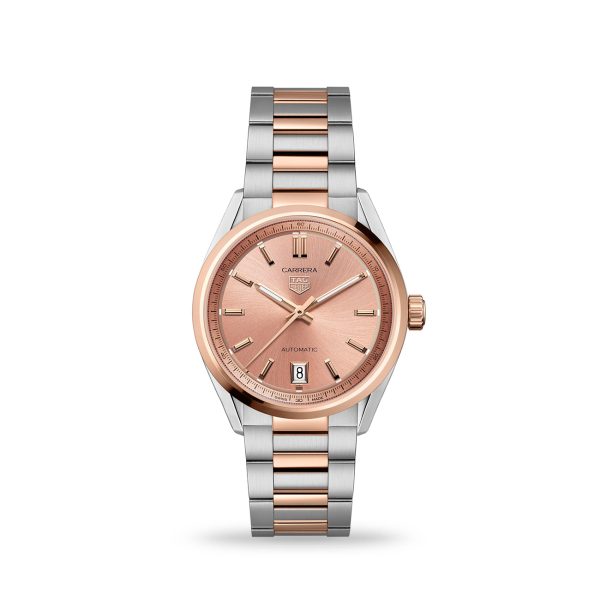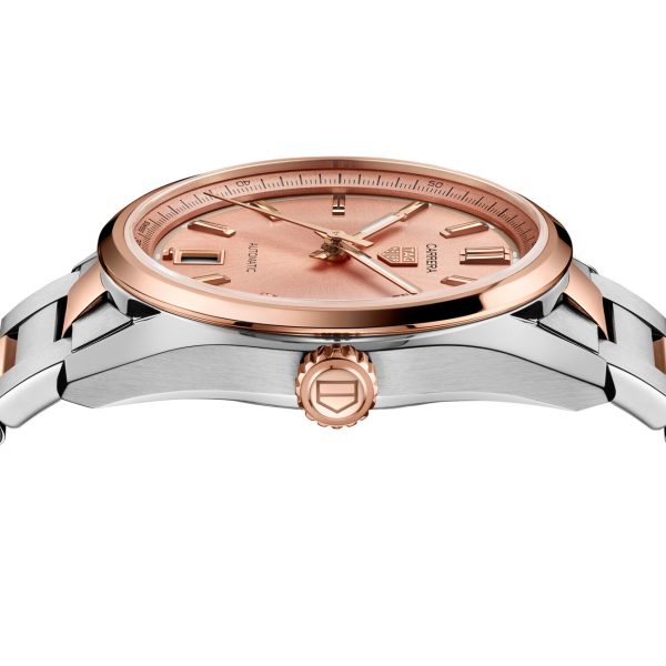 The 18K 5N solid rose gold bezel & matching crown stand boldly atop the fine-brushed and polished steel case, a testament to TAG Heuer’s commitment to precision & allure.
