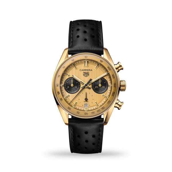 Discover the 39mm TAG Heuer Carrera chronograph, with an 18K 3N solid gold construction, adding a luxurious edge to this racer. Buy now!