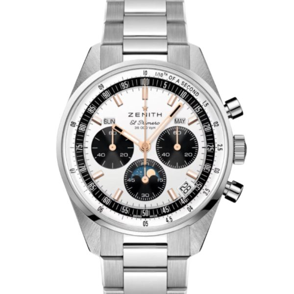 The CHRONOMASTER Original Triple Calendar is crafted in a 38mm steel case with steel bracelet, paired with a silvery-white “panda” dial displaying the day, date, month and moonphase. Powered by the El Primero 3610 automatic high-frequency chronograph movement with 1/10th of a second chronograph function and a power reserve of 60 hours.