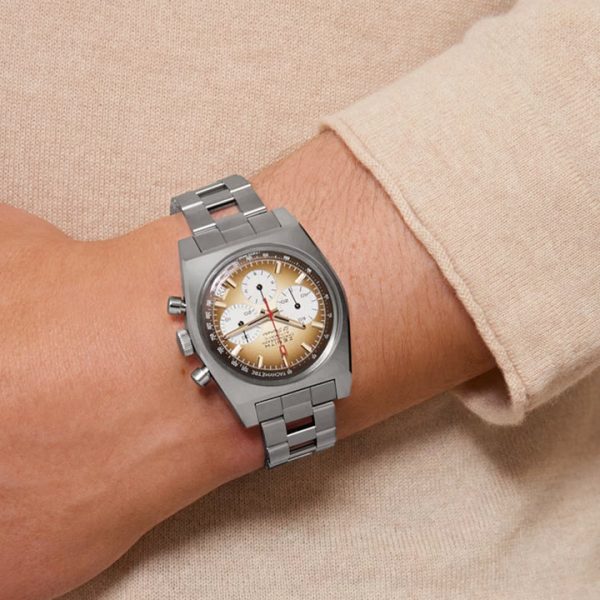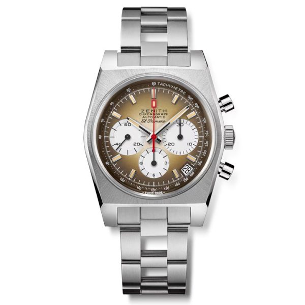 A modern remake of the A385 from 1969, one of the first steel watches to house the El Primero automatic chronograph calibre, in stunningly accurate detail. The 37mm tonneau shaped case houses a gradient dial in warm tones that darken towards the edges. Paired with steel ladder bracelet.