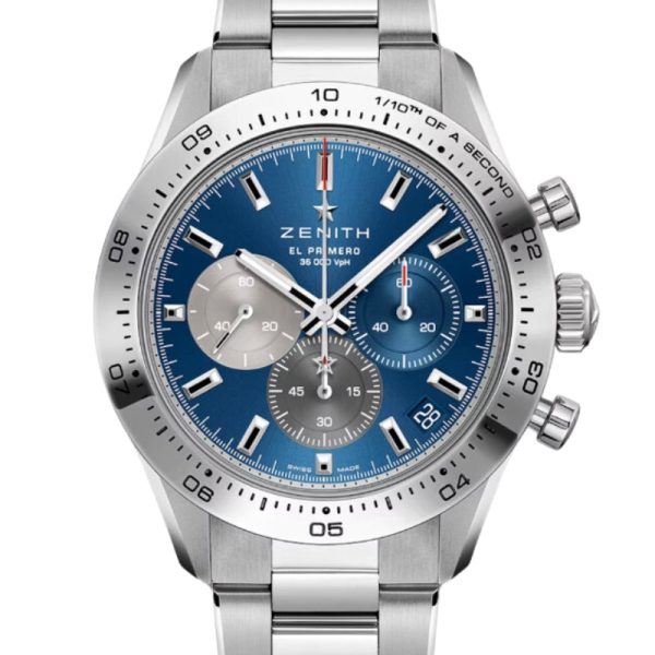 The CHRONOMASTER Sport is crafted in a 41mm steel case with a polished steel bezel, paired with a metallic blue tricolour dial and a steel bracelet. Powered by the El Primero 3600 automatic high-frequency chronograph movement with 1/10th of a second chronograph function and a power reserve of 60 hours.