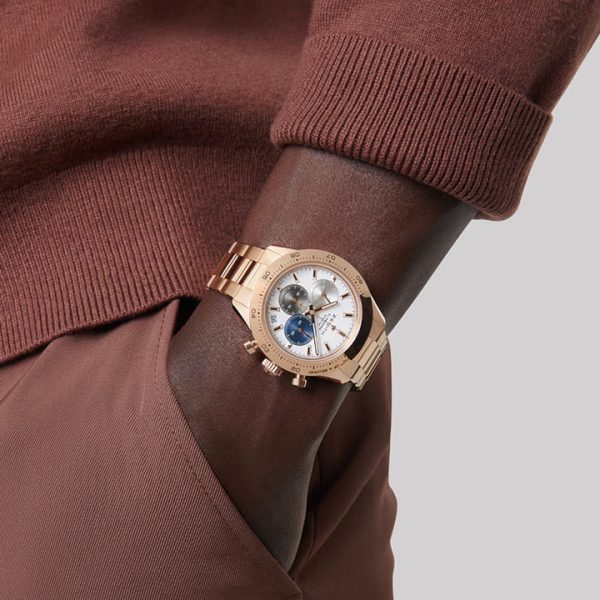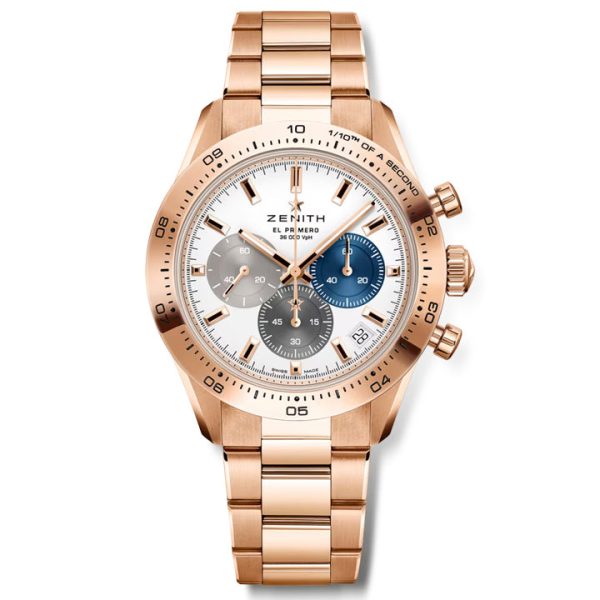 The CHRONOMASTER Sport in rose gold combines elements of past ZENITH chronograph references such as the white tricolor dial, pump-style pushers and gold bracelet in a modern 41mm steel case. Powered by the El Primero 3600 1/10th of a second automatic chronograph movement.