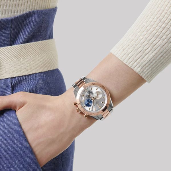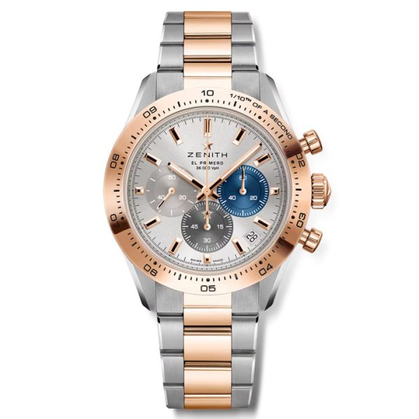 The CHRONOMASTER Sport in steel and rose gold combines elements of past ZENITH chronograph references such as the silver tri-color dial, steel & gold bracelet in a modern 41mm case. Powered by the El Primero 3600 1/10th of a second automatic chronograph movement.